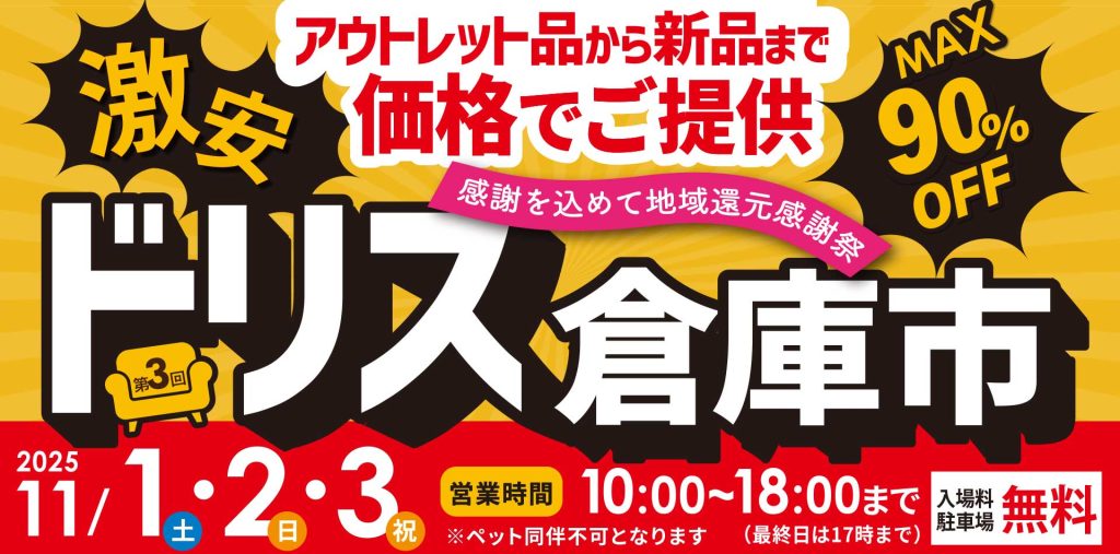 3日間限定でお得な家具がGETできるイベント「第三回ドリス倉庫市」開催のご案内です。